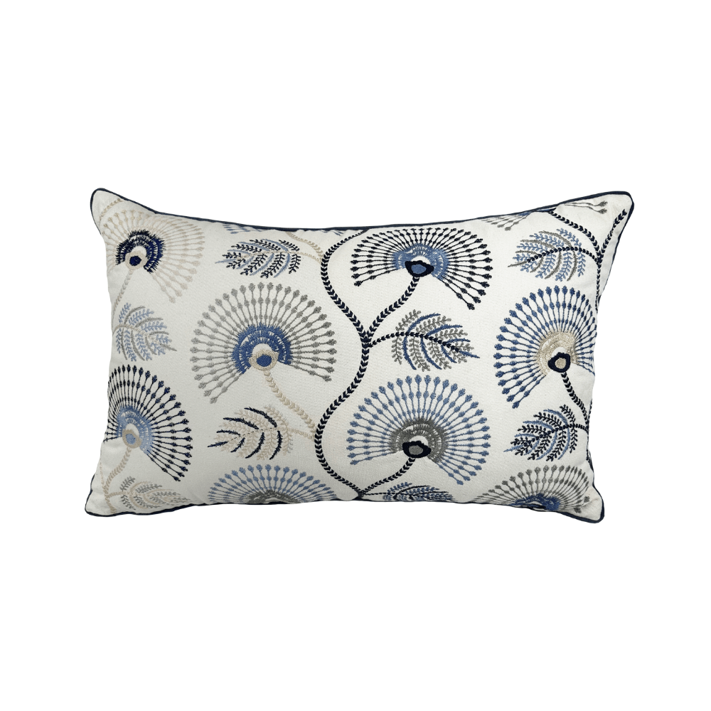 Com 35x53cm, é ideal para sofás, poltronas e camas, garantindo charme e aconchego ao ambiente. O bordado botânico em azul adiciona delicadeza e estilo, enquanto o acabamento em cordão valoriza ainda mais a peça.