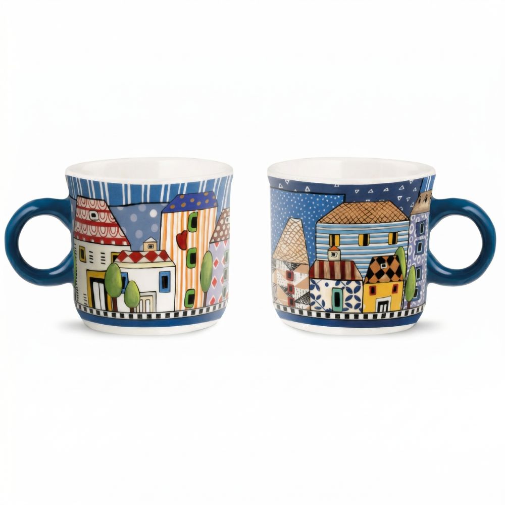 Esta peça é uma celebração da estética mediterrânea, combinando a nobreza da porcelana com o design artístico que é marca registrada da fabricante. Projetado para ser o destaque do seu cantinho do café ou da mesa posta, este conjunto apresenta ilustrações estilizadas de vilas italianas em tons de azul profundo e cerúleo, transformando cada dose de café em uma experiência de estilo Italian Chic contemporâneo.