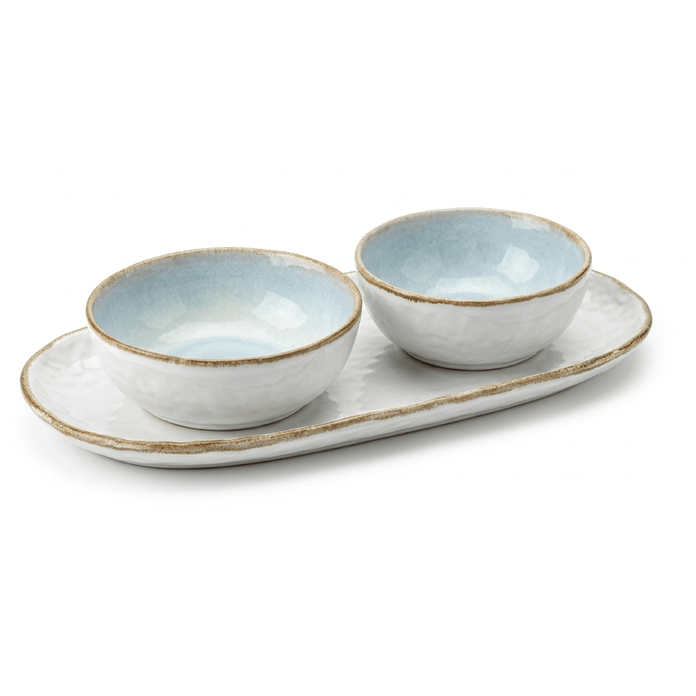 JOGO DE TRAVESSA E BOWLS ORION CERÂMICA BEACH 3 PEÇAS COPA CIAO Jogo Orion Cerâmica Beach da Copa Cia é a tradução da elegância litorânea para a sua mesa. Composto por uma travessa de formato orgânico e dois bowls coordenados, este conjunto de 3 peças destacase pelo seu acabamento vitrificado em tons suaves de azul e areia, remetendo à serenidade das praias.As bordas possuem um detalhe rústico proposital, conferindo um aspecto artesanal e exclusivo a cada peça. É a escolha ideal para servir petiscos, molhos, guarnições ou entradas em recepções que pedem um toque de frescor e sofisticação. Produzido em cerâmica de alta qualidade, une a beleza estética à durabilidade necessária para o uso cotidiano ou ocasiões especiais.