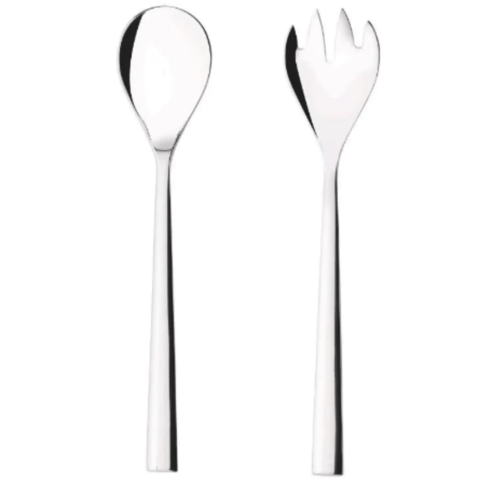 Composto por garfo e colher de servir em aço inoxidável, o conjunto é ideal para servir saladas, massas, frutas e acompanhamentos de forma prática e higiênica.